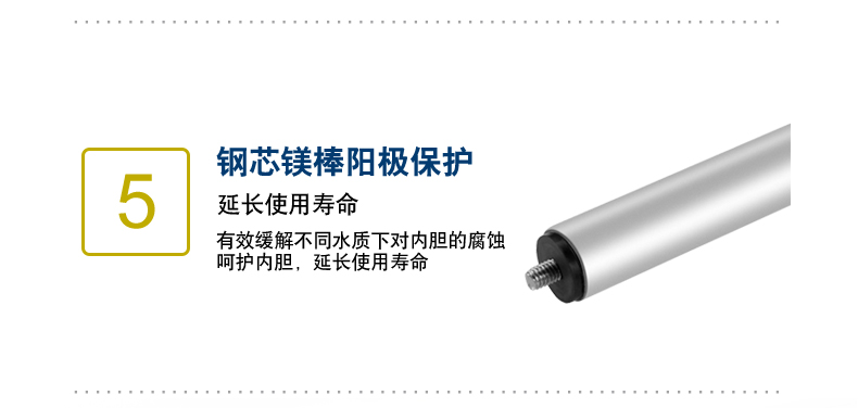 鋼芯強(qiáng)力陽極棒,有效緩解不同水質(zhì)下對(duì)內(nèi)膽的腐蝕,大大延長(zhǎng)熱水器的使用壽命。