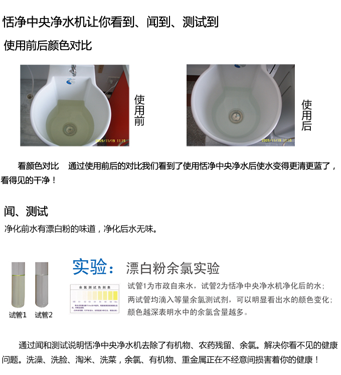全屋中央凈水機(jī)有效去除水中的異色、異味;進(jìn)一步濾除水中微小雜質(zhì)、膠狀體;去除水中的漂白粉余氯、農(nóng)藥、重金屬;保留對(duì)人體有益的礦物質(zhì)。使水變得碧清、碧藍(lán),去除對(duì)人體有害的物質(zhì)。